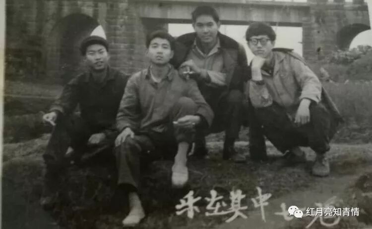 同班男同学付绍先(左1)、陶玉河(左3)、杨毅(左4),二班同学冉隆全(左2)落户梁平县的实地留影。其时4人已落户3年,题照“乐在其中”,表达乐观积极心态。以后4人先后返城,其中陶玉河在农村入党,担任大队会计,成为最后返城知青