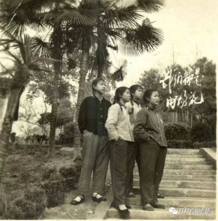 1969年初,同班女同学张宗凡(左1)、唐振国(左2)在下乡告别家乡前,相邀到万县市西山公园留影,题照“向阳花”,表达上山下乡决心