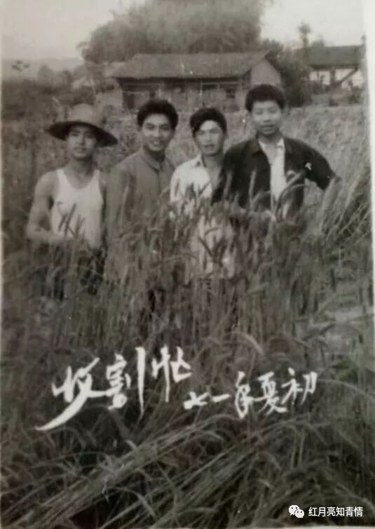 同校同年级的几位下乡男同学在收割季节的实地留影