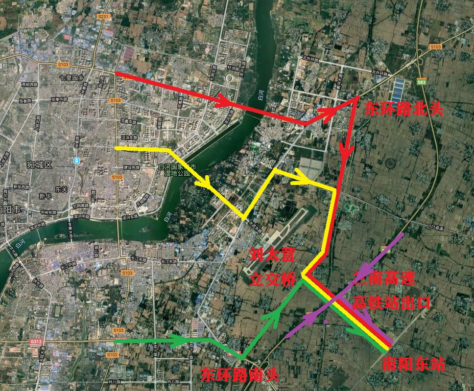 路线一: 中心城区北部车辆去高铁站走图中红线 从信臣路向东经南阳大桥跨越白河,交迎宾大道后继续向东北方向行驶1.5公里至东环路北头,右转沿东环路向南行驶6公里至刘太营立交,交高铁站快速通道向东行驶约4公里到达高铁站。