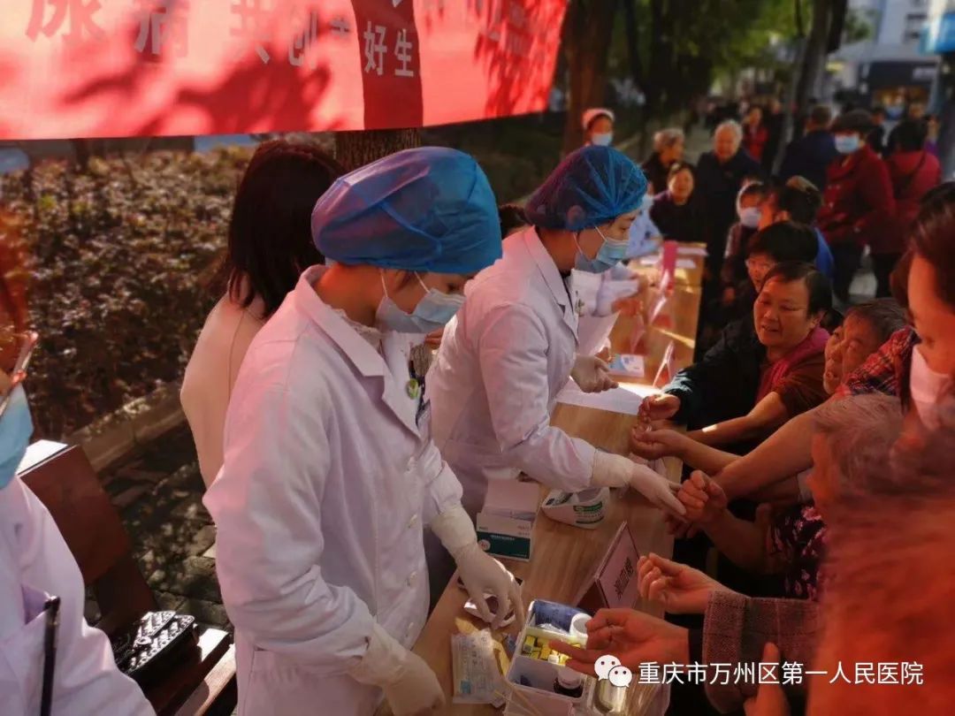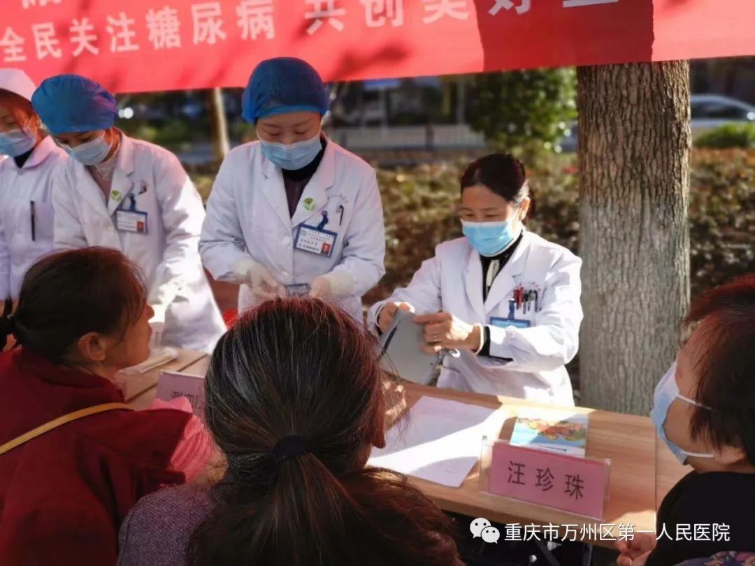 11月13日上午,我院内分泌肾病科科主任汪珍珠带领内分泌医护团队及周家坝卫生服务中心工作人员一行在周家坝中国电信门口举行了以“全民关注糖尿病,共创美好生活”为主题的“2020年世界糖尿病日大型义诊进社区”活动。我们医护团队对前来咨询的市民一一进行糖尿病患者风险评估、血糖监测、血压测定、BMI指数计算,还给予糖尿病饮食、营养、运动方面的健康指导及发放糖尿病相关知识手册。对指血糖控制未达标的患者给予加测糖化血红蛋白,并给予个性化的治疗方案调整及自我管理指导;糖尿病专科护士就患者在饮食控制、规律服药、血糖监测和日常运动中应该注意的事项给予了具体的指导意见,向大家宣传糖尿病是可以预防和控制的,教育群众改善饮食结构,适当控制体重,增强体质锻炼,提高生活质量,远离糖尿病。汪珍珠主任建议广大市民要“科学饮食、合理运动,禁烟限酒、控制油盐,少食油炸、油煎食物。预防糖尿病,要“管住嘴、迈开腿”。