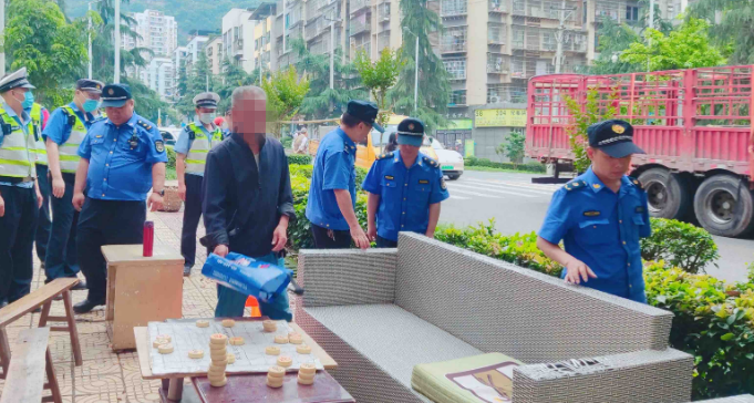 当执法人员途经一人行道处,眼前的一幕让人大跌眼镜:几位市民在通道上摆放沙发、茶几、板凳、遮阳棚等物,搭建起一个面积20多平方米的临时休闲区,其中两人还在茶几上摆放象棋,正在展开精彩博弈。