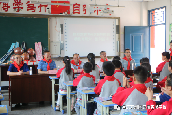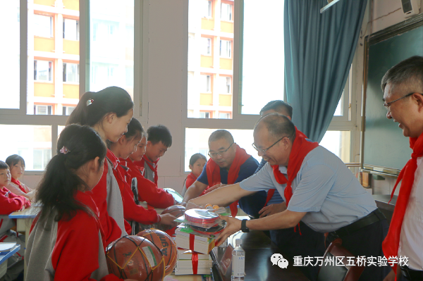慰问中,五桥实验学校少先队员代表为参加慰问的领导敬献了红领巾,全体少先队员唱响了《中国少年先锋队队歌》。涂立军副区长代表慰问组为孩子们赠送了学习用品。