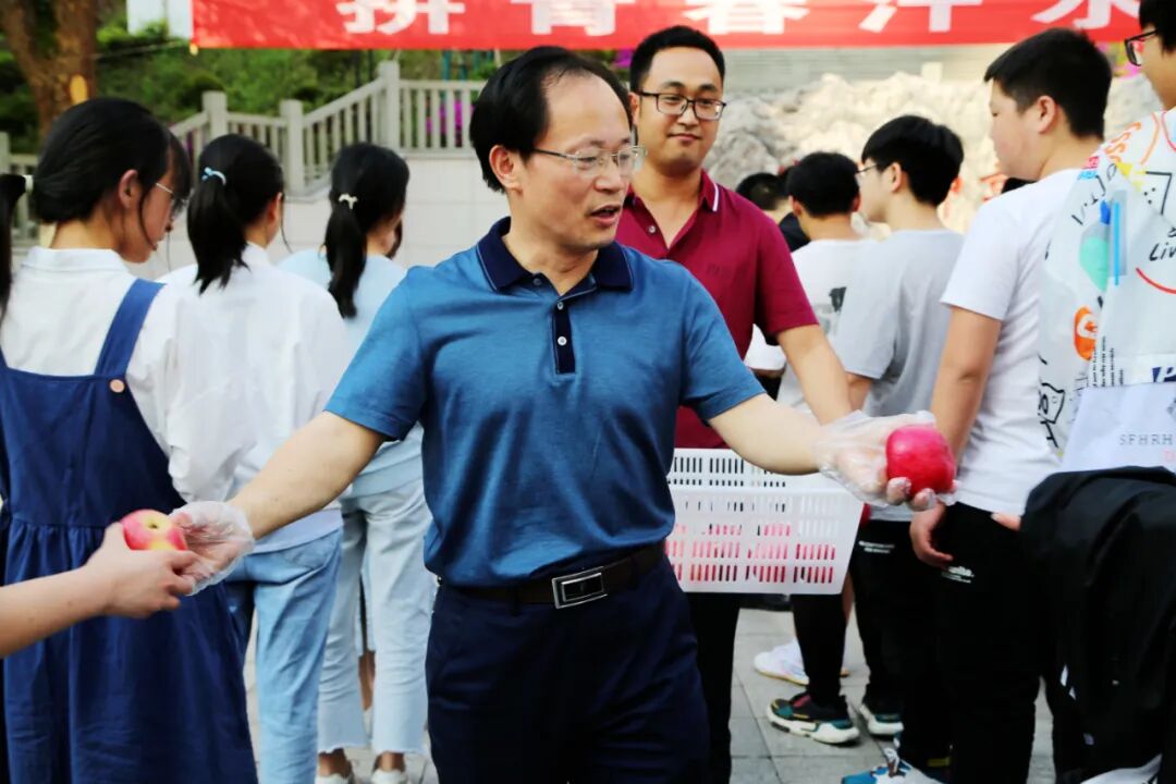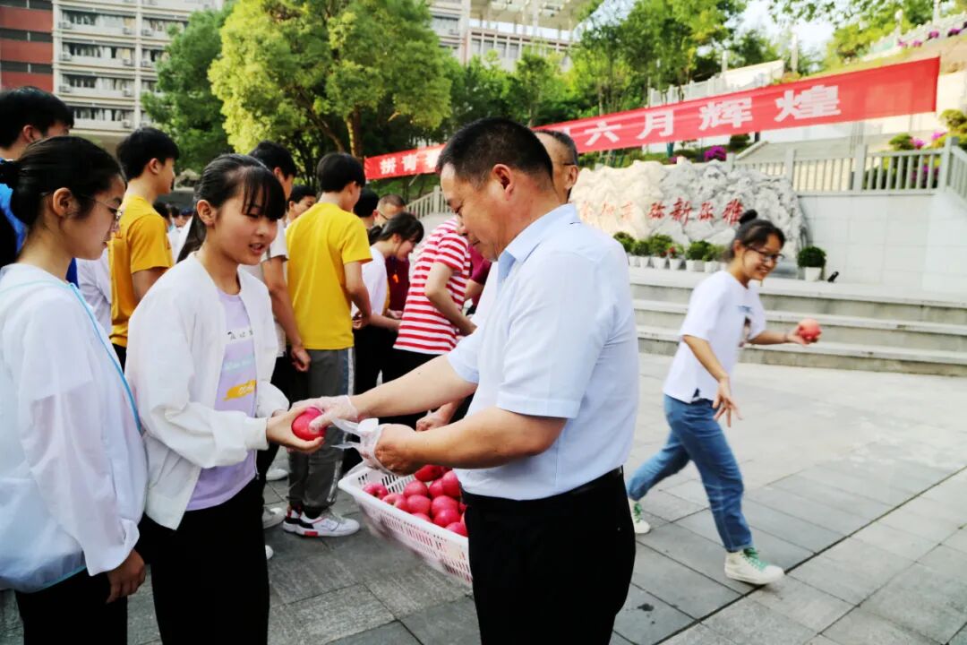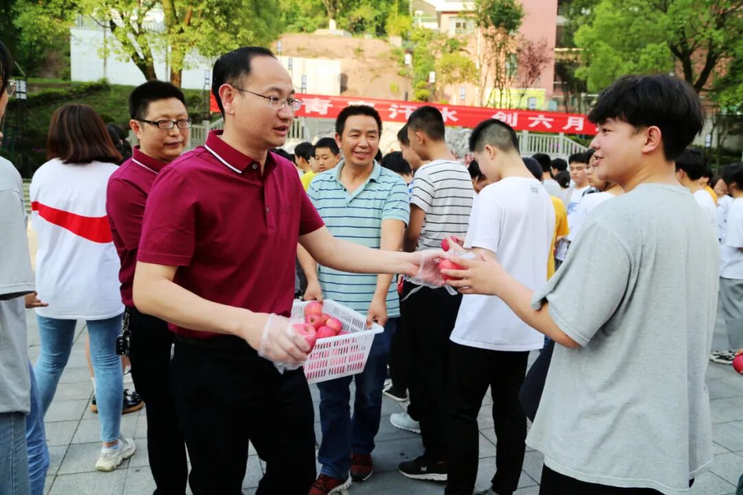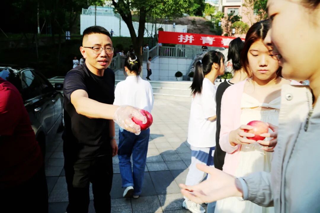 最后,校长李吉海,党委副书记邓光江,纪委书记何天福,副校长任朝刚、张象和初2021届班主任一道为全体初三学生送上充满爱意的红苹果,寓意红红火火,鸿运当头。