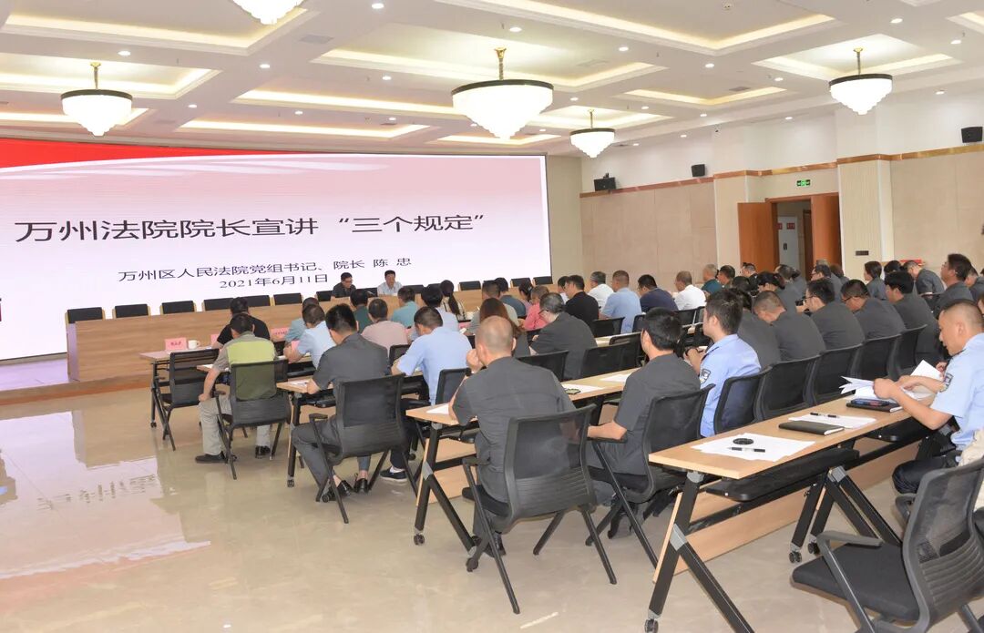 6月11日,按照区政法队伍教育整顿领导小组安排,万州区法院党组书记、院长陈忠作“三个规定”专题宣讲,区委政法委副书记沈毅主持宣讲,部分镇乡、区级部门主要负责人及区法院中层以上干部参加。