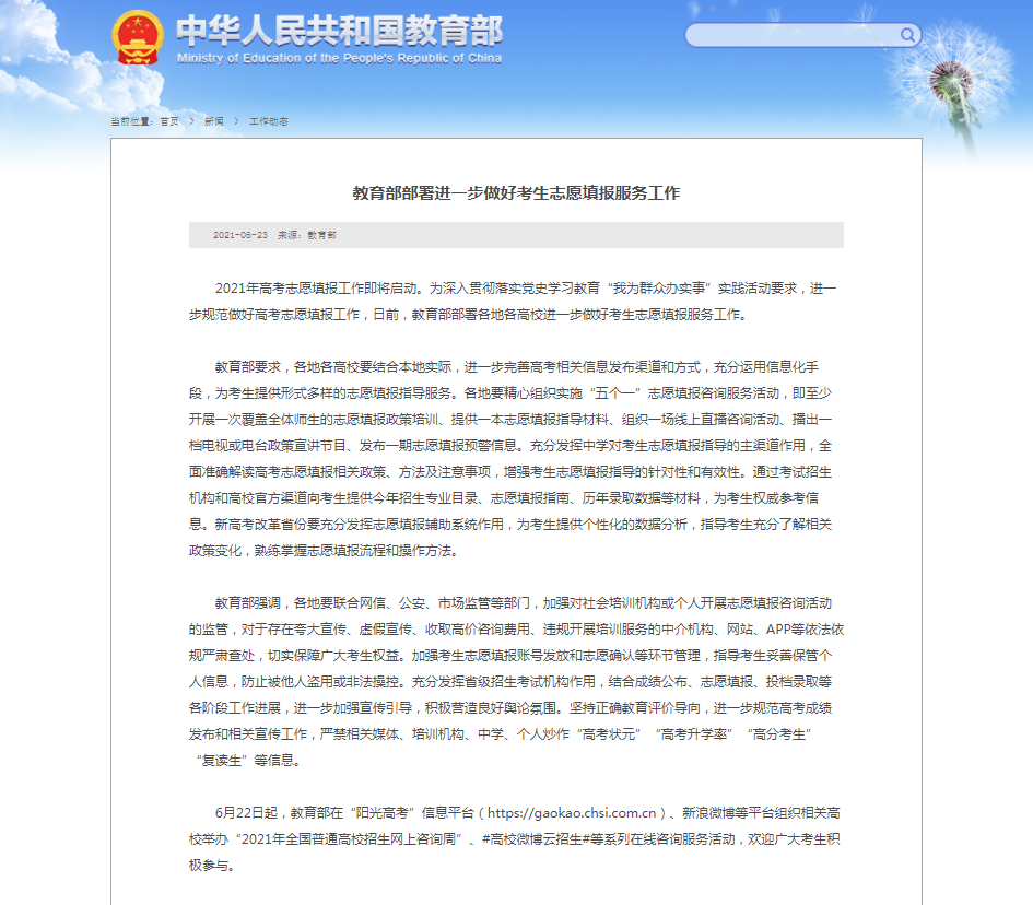 2021年高考志愿填报工作即将启动。为深入贯彻落实党史学习教育“我为群众办实事”实践活动要求,进一步规范做好高考志愿填报工作,日前,教育部部署各地各高校进一步做好考生志愿填报服务工作。