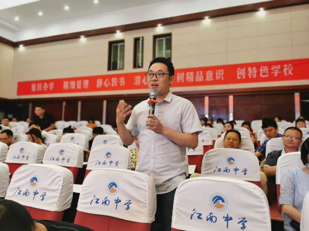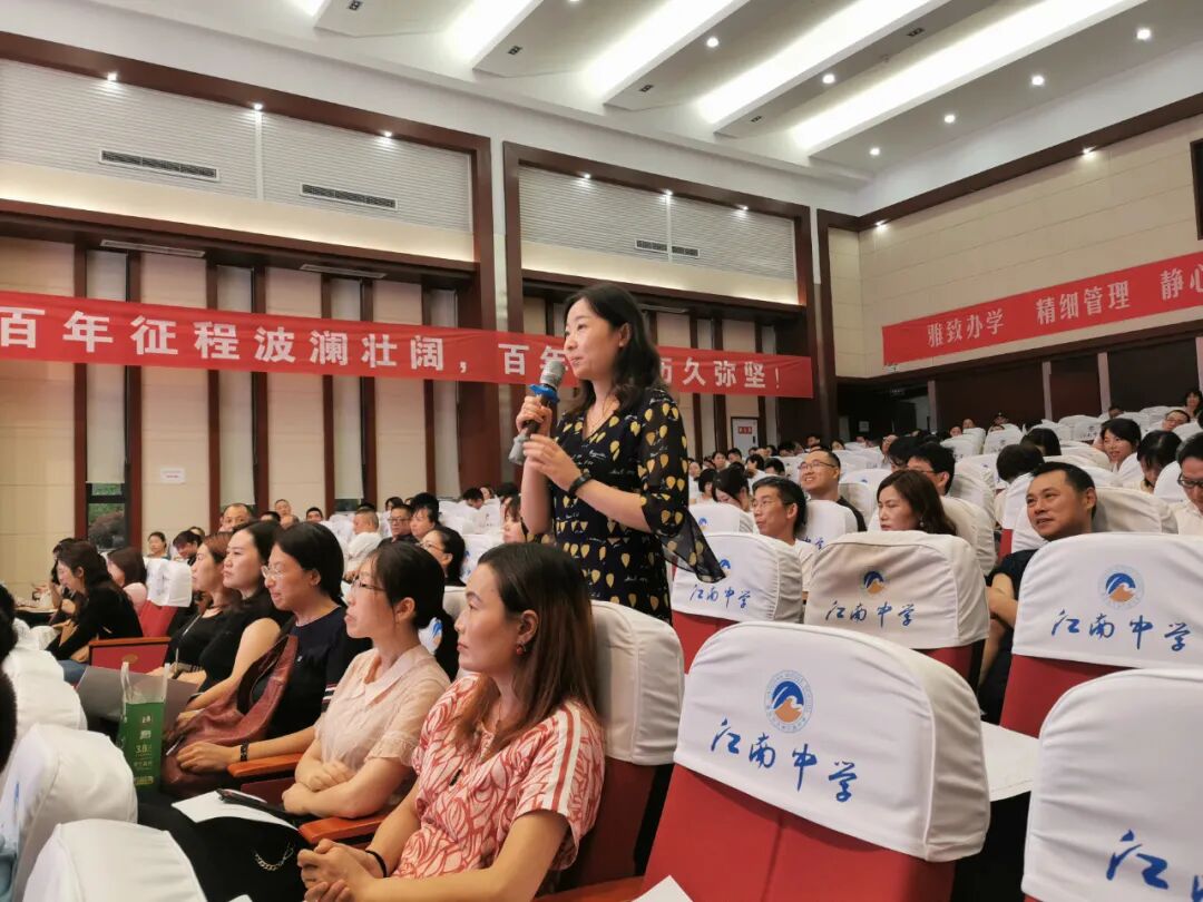 抛出三个问题:谈谈江南中学最宝贵的文化传统;当下你在教育教学中的主要困惑;个人在教育实践中最重要的体会。老师们积极参与,热情高涨。