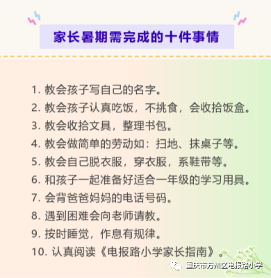 为帮助孩子和家长更好、更快的适应即将到来的小学生活,学校也为家长们制定了详实的暑假计划,如家长暑期需完成的十件事情。