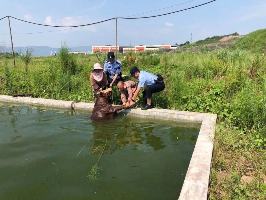 “派出所吗?九龙工业园这里有头大黄牛掉水池里了,我们拉了半个多小时都不得行,你们赶快来救它。”7月14日下午3时许,万州区公安局龙都派出所接到一群众报警。