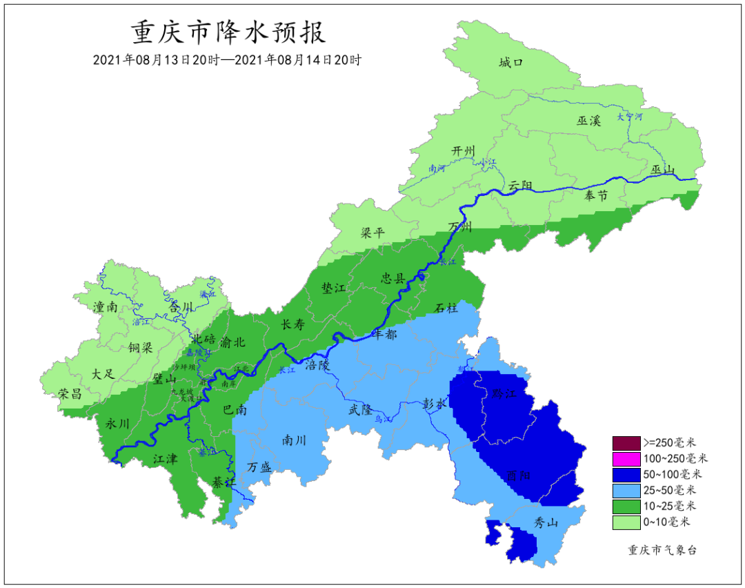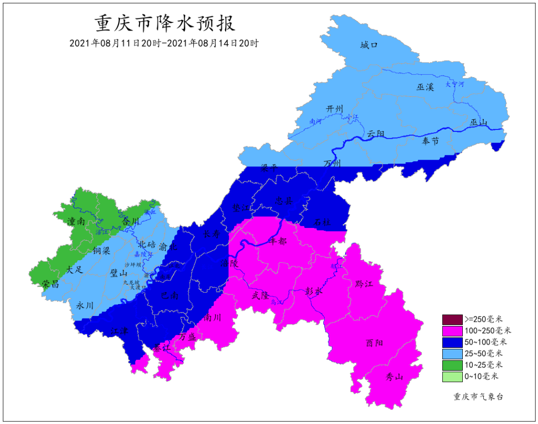 8月11日07时―12日07时,重庆丰都、巫山、武隆、石柱、彭水等5个区县的13个雨量站达大暴雨,铜梁、南川、丰都、巫溪、巫山、云阳、武隆、彭水、 黔江、石柱等10个区县的95个雨量站达暴雨。