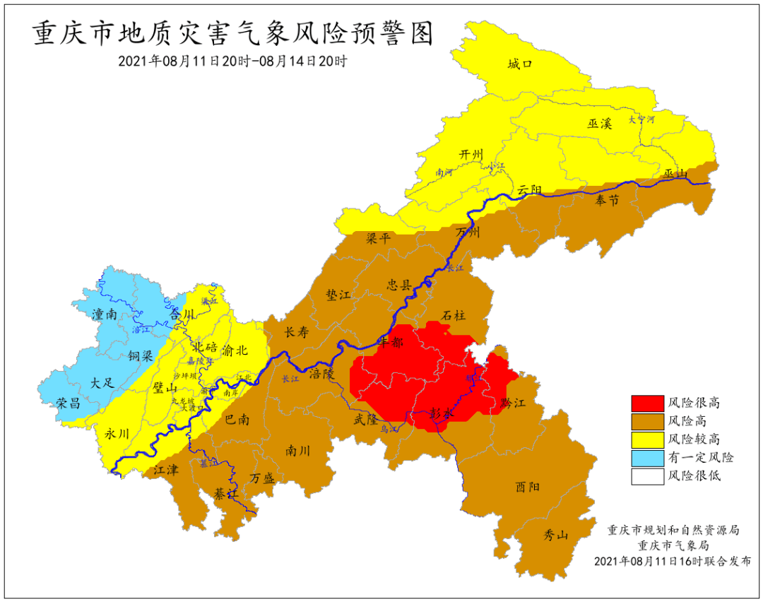 8月11日夜间至14日夜间,涪陵、丰都、黔江、石柱、武隆、彭水,属于风险很高地区,地质灾害气象风险等级为一级(红色预警)。