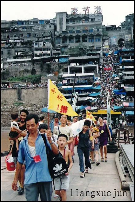 2002年9月巫山码头一批外迁移民马上就要上船了将直接乘船迁往1000公里外的江西景德镇。这批移民在数百年前“湖广填四川”时从江西景德镇迁徙过来的,100多年后她们又将迁徙回“老家”,三峡库区有近一半以上的当地居民都是“湖广填四川”的时候从江西、安徽等省迁徙来的。李风 摄