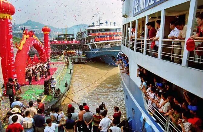 2001年5月14日,重庆三峡库区云阳县故陵镇2014名移民乘船经过建设中的三峡大坝工地。