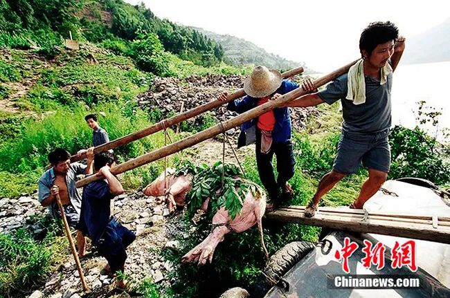 2002年7月20日,三峡库区忠县的移民正在把家里养的猪转运上船。三峡库区100多个城镇开始了大搬迁。李风 摄