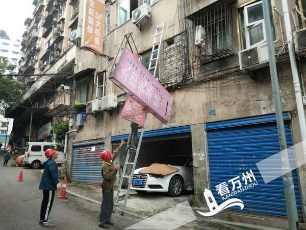 在新世纪对面,一栋建筑物上镶嵌了“巨幅画框”,铁架焊接的广告架覆盖了四层楼还多,几乎给整栋楼镶了个边,但中间的喷绘广告早就破损了,只残留了一角,在风中拂动着,非常影响城市形象。在麻柳林巷道驿鑫大厦外墙上,也有多块喷绘广告破破烂烂,吊在空中。执法人员一一对其进行了拆除。