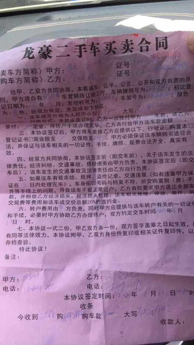 尊敬的各位领导!我于2020年3月25日到万州龙豪二手车公司买了一辆长安金牛二手车,他们杨彬老板口口声声说这辆车05年买的4年了3万多公里车况良好,由于我是从来没有接触过汽车验车时又没有经验,让我支付了一万千七元现金!把车开出来时方向盘抖动的历害于是我就开车到一家汽车修理厂去检查一下结果方向杆轴承方向杆坏了花了520元结果就发现了些车原来保养提示单显示是67192公里。保养时间被毁,车后门极难打开。二手车私自调码表里程超过半数以上的33600手段来欺骗消费者使我经济严重受损、人格尊严受到及大影响。车辆发票只开了5千元又是偷税行为。望政府有关部门给我们老百姓作主让这种不诚信的商家付出沉重的代价。1.我请求退一赔三。2.严查偷税漏税。