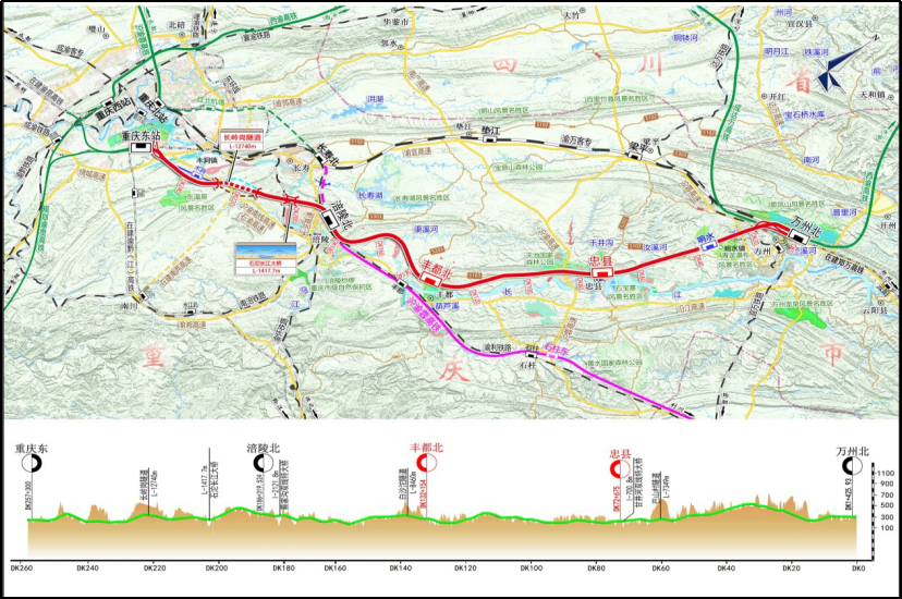 渝万高铁是国家“八纵八横”高速铁路京昆、包(银)海通道和重庆“米”字型高铁网的重要组成部分,是沿江高铁通道的重要辅助通道,是形成全线350公里时速郑渝昆、西渝昆(贵)的关键工程。线路自重庆东站引出,途经南岸、巴南、涪陵、丰都、忠县、万州,共设5座车站,线路全线251.38km,设计时速350km/h,总投资527.6亿元,建设工期4.5年。