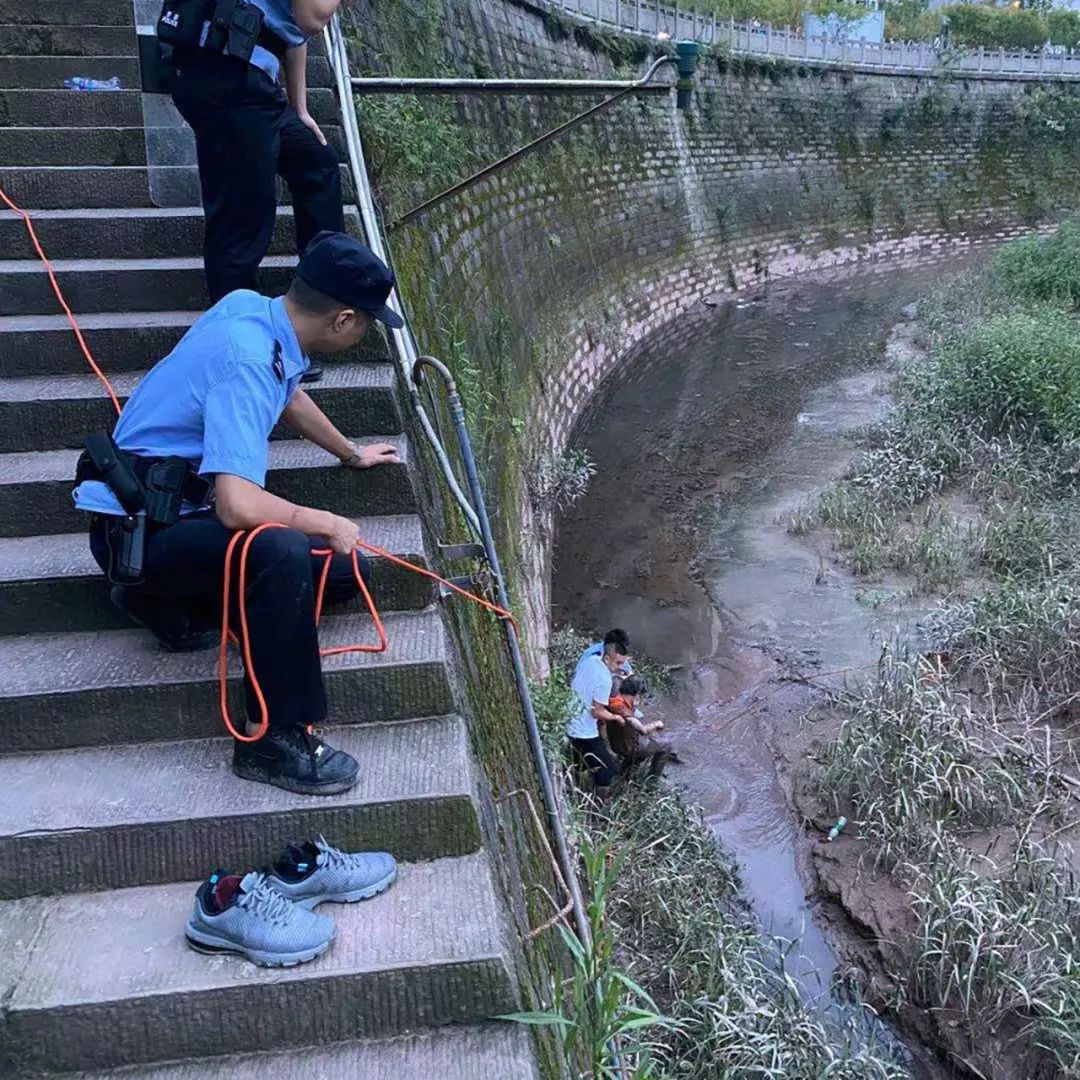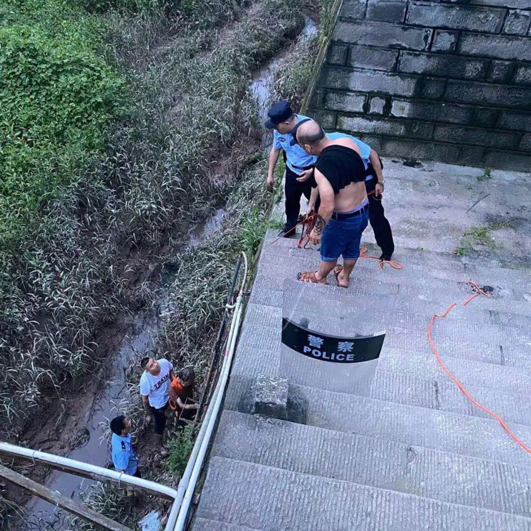 “情况紧急,多耽搁一秒就多一分危险,立即实施救援!”对现场进行短时观察和研判后,副所长唐宇生一声令下。随后,两名民辅警迅速系上救生绳,借助河道岸墙上的铁梯下往河中,其余人员则在上面拉绳保障安全。